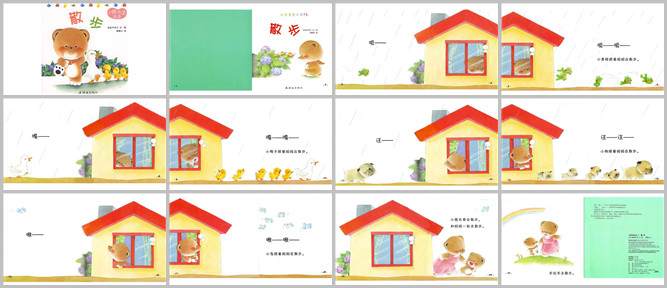 《散步绘本》绘本故事PPT。呱,呱、呱。小青蛙跟着妈妈去散步。嘎,嘎、嘎。小鸭子跟着妈妈去散步。汪,汪、汪。小狗跟着妈妈去散步。啾,啾、啾。小鸟跟着妈妈去散步。小熊也要跟着妈妈一起手拉手去散步