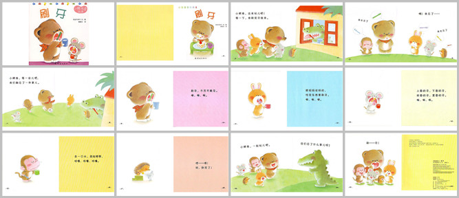 《刷牙》绘本故事PPT。出来玩吧,小鳄鱼。等下,我刷完牙就出来。啊,我也忘了刷牙了。小鳄鱼,等一会,我们都忘了一件事。刷牙千万不能忘。和妈妈说好的,吃完饭要刷牙。前面的牙,里面的牙,上面的牙,下面的牙。含口水,鼓起腮帮,咕噜咕噜。好,刷完了。小鳄鱼来一起玩吧,你们忘了什么事吗