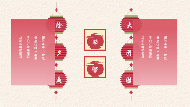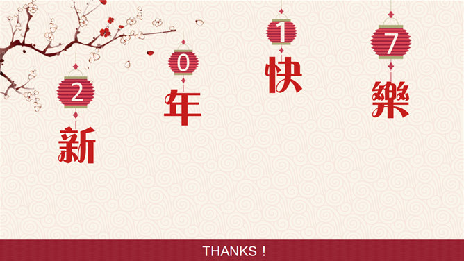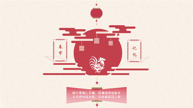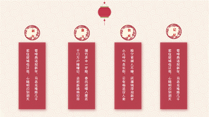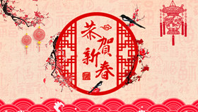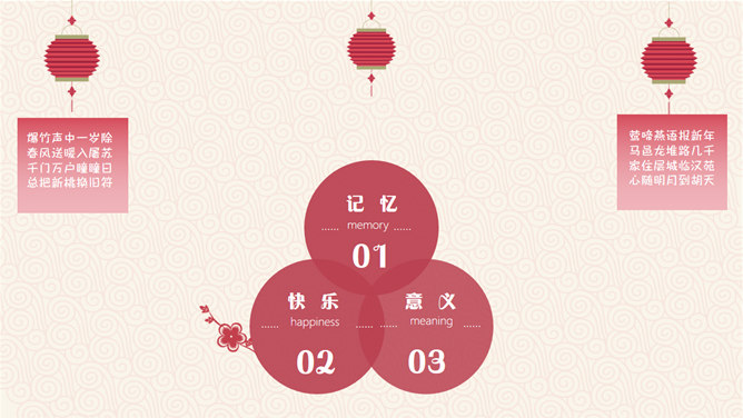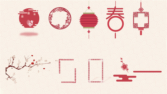 喜庆春节新年快乐PPT模板。一套农历新年春节主题幻灯片模板,喜庆红色主色,灯笼、梅花、祥云等传统元素设计。使用字体:方正粗活意繁体、MEllan PRC Xbold、MComic PRC Medium、MGentle PRC Xbold、华文行楷。