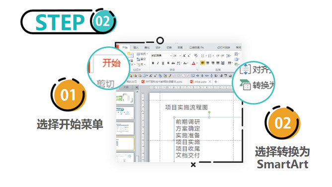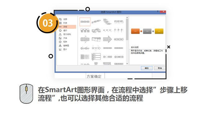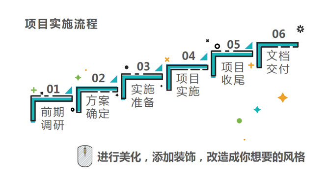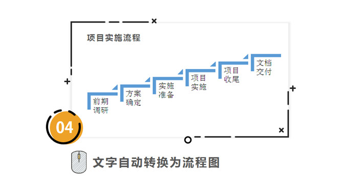 绘制PPT流程图技巧教程。一、文字转换图形:1、先在文本框中输入流程名称。2、选择开始菜单,选择转换为SmartArt。3、在SmartArt图形界面,在流程中选择”步骤上移流程”,也可以选择其他合适的流程。4、文字自动转换为流程图。二、成品美化:进行美化,添加装饰,改造成你想要的风格。