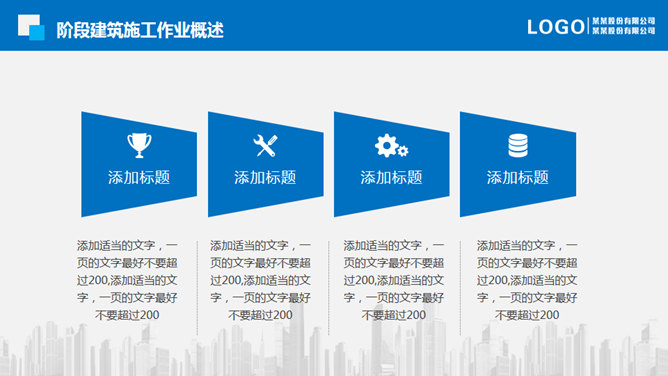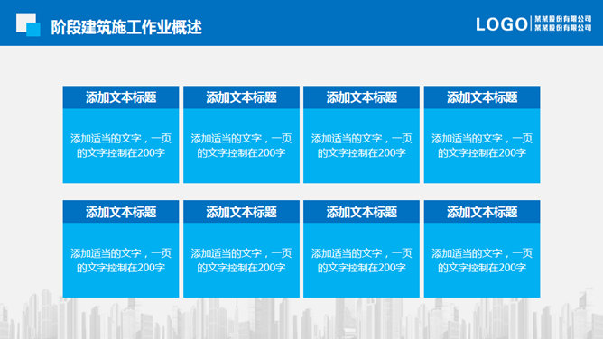 地产建筑施工项目报告PPT模板。一套建筑房地产行业项目汇报幻灯片模板,清爽蓝色主色调,页面丰富结构完整。