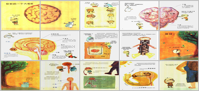 《做梦的脑》绘本故事PPT。哇,这个核桃好大呀。这是大脑,不是核桃。大脑能做什么呢?脑能思考、活动四肢、消化排泄、听看吃喝,实际上你做的任何事情都是脑做的。那大脑在哪呢?就在你硬硬颅骨里,像豆腐一样软。把脑拿出来就像一个皱皱巴巴的干核桃。大脑分为左脑和右脑,左脑控制右半边的身体,右脑控制左半边身体。大脑在脑中占据着大部分位置,小脑能帮助我们调节身体的运动和平衡
