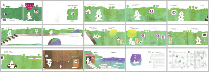 《兔子先生去散步》绘本故事PPT。兔子先生家门上有一个兔子标志。他要到外面走走。刚出门,兔子先生看到了一个往前走的标志。再往前走,看到了一个标志。咦,这是什么标志呀。啊!知道了,是楼梯的标志。这又是什么标志?是桥的标志。接下来这个标志好怪啊。哎呀,原来是小心斜坡的标志。又有一个看不懂的标志。原来是摔一跤眼泪汪汪标志。现在是回家还是继续向前走呢。继续往前走吧。注意路上的标志哦