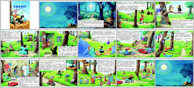 《全都是我的》绘本故事PPT。花袜子小乌鸦总是拿朋友们的东西。如果谁不留神,没把自己的东西牢牢抓住,严严捂住,紧紧捆住,就会落到花袜子手里。大家的好东西都跑到乌鸦窝里了。花袜子一看到好东西就像占为己有。一天,小刺猬把泰迪熊放在了洞口,一会的功夫,花袜子就飞过去把玩具熊拿走了,这叫顺手牵羊。从此以后,大家都开始提防花袜子。花袜子也想出了很多招数