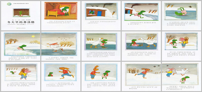 《冬天里的弗洛格》绘本故事PPT。早晨,青蛙弗洛格起床的时候感觉这个世界有点不对劲。他打开窗户,惊讶的发现所有的东西都变成白色的了。他走出房门,到处都是雪,脚下一滑就摔倒了。一路滑到了河里,河水结冰了,弗洛格躺在冰上。没有水我怎么洗澡呢,他想。他坐在河边冻得浑身发抖。这时,小鸭踩着冰鞋滑了过来。“嗨,弗洛格,今天天气多好呀,我们一起溜冰吧。”她说