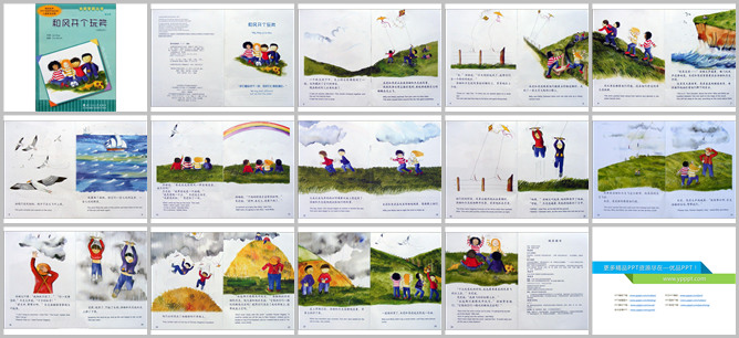 《和风开个玩笑》绘本故事PPT。一天下午,天空上的云朵都聚在一起,太阳藏在了后面。风儿开始出来玩耍了。茉莉和米莉正在看杰克和汤姆放风筝。风筝左晃右晃,就像一只巨大的蝴蝶。汤姆说:走,今天起风了,我带你们去一个好玩的地方。杰克和汤姆把风筝紧紧的拴到篱笆上。茉莉和米莉跟着他们翻过篱笆,走到一条小路上。风在后面推着他们,还在草丛里跳舞。“我们到了。”汤姆大喊着