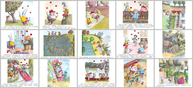 《四个红苹果》绘本故事PPT。“太好玩了,别人可不会哦!”图图兔想。现在他正在玩四个苹果,还一边玩一边哼着小调。这时,噜噜猪走过来了。噜噜猪说:“很好玩吧,我也会,你看。”图图不再哼歌了,说:“我还以为只有我会呢。”噜噜猪说:“不可能啊,这是绵绵羊教我的,不信我们一起去看她。”噜噜猪喊道:“嗨,绵绵,图图以为只有他一个人会玩苹果,你来耍给他看看。”绵绵马上就耍了起来