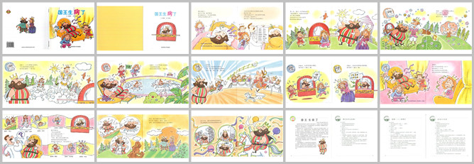 《国王生病了》绘本故事PPT。有一位国王生病了,他睡不着觉,吃不下饭,天天躺在床上,不管国家大事,什么也不想做。大臣们都很着急,请来医生给国王看病,医生说:国王运动太少,所以不舒服,多运动运动就好了。医生给国王列了一张运动计划表。第二天,国王早早就起床了“给我准备轿子,我去运动。”为了让国王变得健康,王后命令大臣和王子轮流陪国王运动。星期一,大王子和国王一起去爬山,到了山顶上,国王说:山上的风景太漂亮了,我现在下山,再重新爬一边