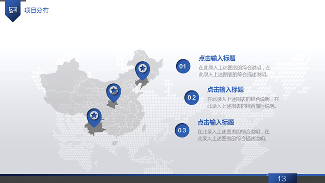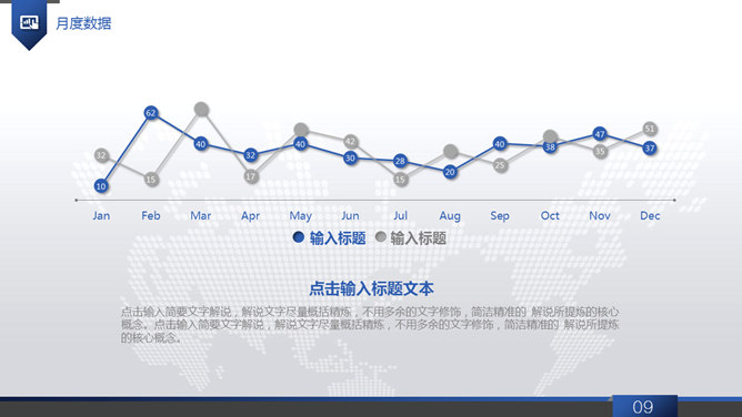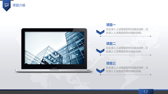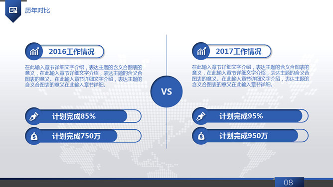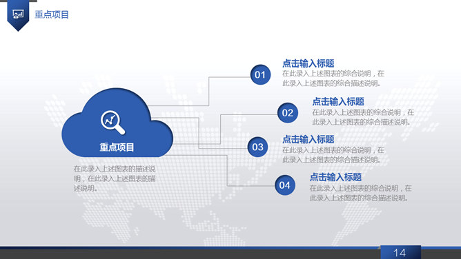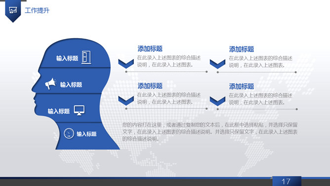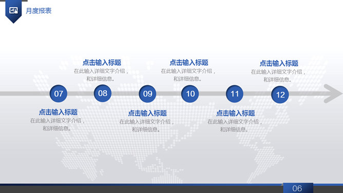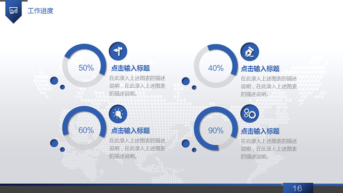 大气动态商务工作报告PPT模板。一套大气商务风工作总结报告幻灯片模板,浅灰世界地图背景,蓝色主色调,共40页,页面类型丰富实用,动态播放效果,稍作修改可用于公司介绍、产品宣传等其他用途。