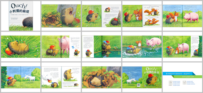 《小刺猬的麻烦》绘本故事PPT。在一颗大苹果树下,一只小刺猬刚刚做好了一个不大不小的窝,正好可以在里面温暖的睡一个冬天。突然一个大红苹果落在了她的后背上,哎呦,好痛。小刺猬缩成了一个球,希望苹果能掉下来,可是它伸开身体的时候,苹果还是在她的背上。这时一只手里抱着坚果的小松鼠正在赶路,看到了小刺猬,停下了帮忙。于是,他拉啊,推啊,抓啊,扭啊。可是大红苹果还是好好的呆在小刺猬的背上