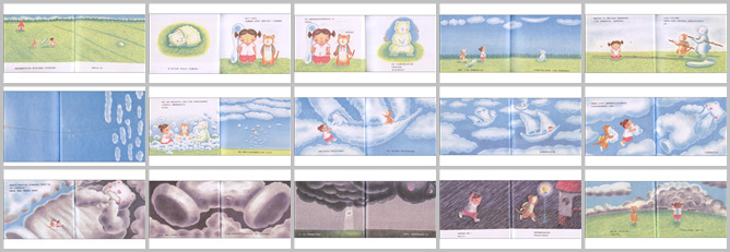 《好饿的小白熊》绘本故事PPT。鲁鲁和莎娜正在散步,突然看见草丛有一团白色的东西,她们走过去察看,咦,原来是一只无精打采的小白熊。“你怎么了?”她们问。小白熊说:“我正玩的时候突然感觉肚子饿了,然后就回不了家了。”于是鲁鲁和莎娜拿出她们自己的点心说:你吃吧。可是小白熊看看了却不吃,呆呆的坐着。“是不是不爱吃点心?那你喜欢吃什么?”小白熊指指天空的云朵