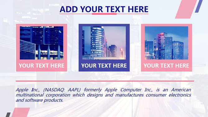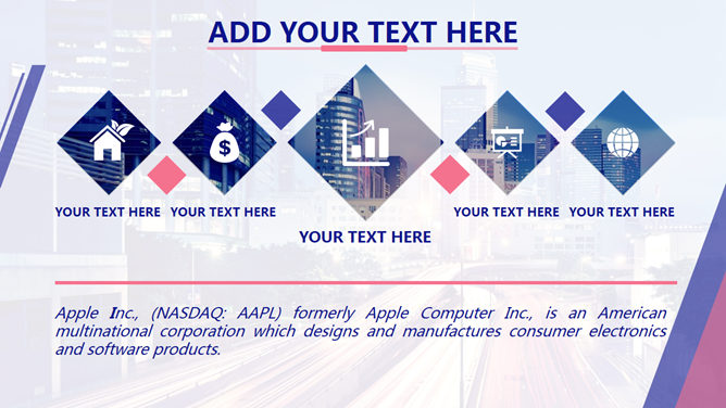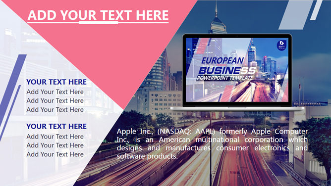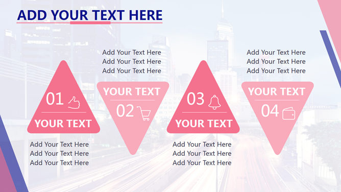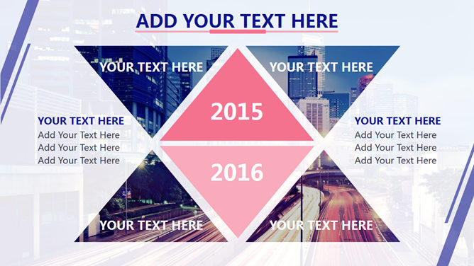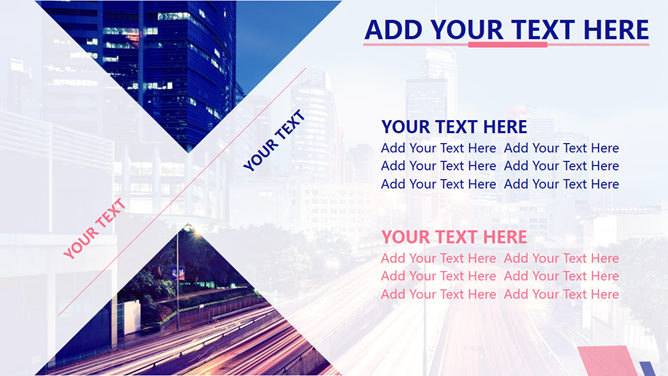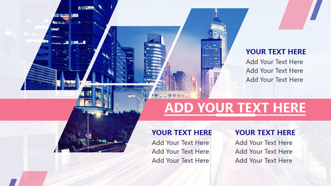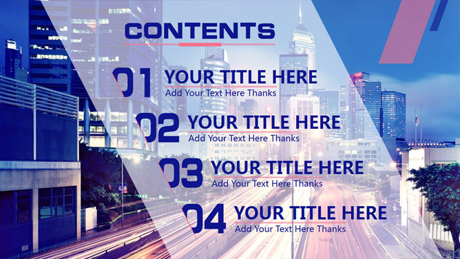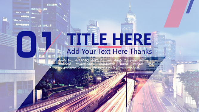 炫彩动态都市杂志风PPT模板。一套时尚杂志风幻灯片模板,都市夜景背景,创意色块图形排版,动态播放效果。使用字体: