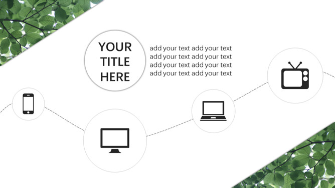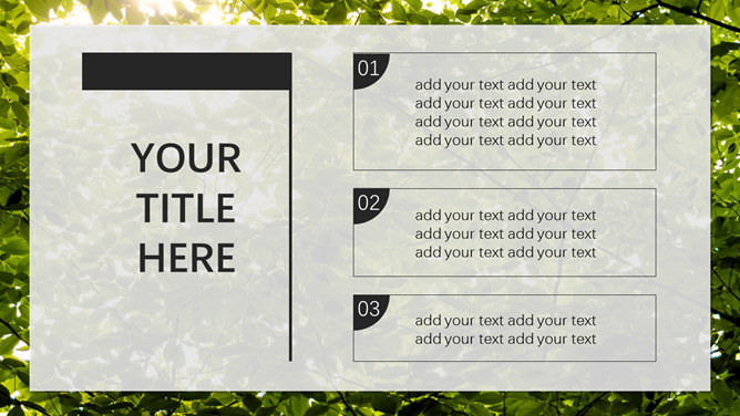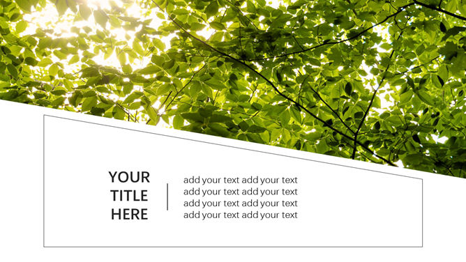 清新夏日生机绿叶PPT模板。一套多功能通用幻灯片模板,生机盎然的大树绿叶背景,创意内页排版设计。