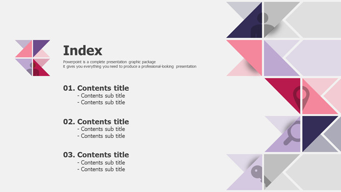 创意三角形主题设计PPT模板。一套很有创意的幻灯片模板,采用三角形装饰,能胜任多种场合。