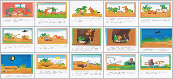 《弗洛格找宝藏》绘本故事PPT。弗洛格说:我们快点吃早餐,今天我们去挖宝藏。小熊说:挖宝藏?什么意思?弗洛格说:跟着我走,一会你就明白了。我们要挖一个深洞,一直挖一直挖,直到挖到宝藏。小熊说:要是根本就没有宝藏呢。宝藏肯定会有的,我保证,弗洛格说。说着,弗洛格停下来指着地面说,我们要在这发现宝藏,就在这里。小熊问:你怎么知道的?我就是知道嘛,弗洛格说