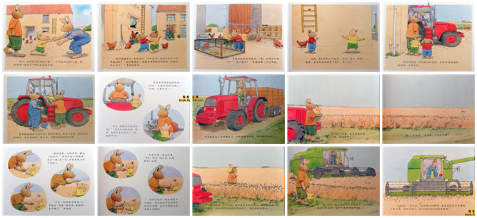 《汤姆去农场》绘本故事PPT。早晨,爸爸早早就把我叫起床了。我今天不上幼儿园,和爸爸一起到乡下帮叔叔收庄稼。见到了鲁诺堂兄,我高兴极了。我对鲁诺说:“我要和爸爸一起开拖拉机。”鲁诺接着说:“我和爸爸一起开联合收割机,比拖拉机大多了。”鲁诺和我一起来到鸡笼旁,指着小鸡说:“看,这只小鸡多可爱,这只最壮。”突然传来一阵马达声。“快来,叔叔和爸爸要把我们丢下了!”