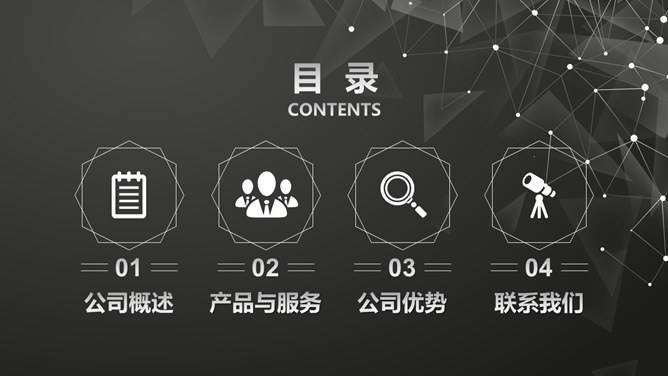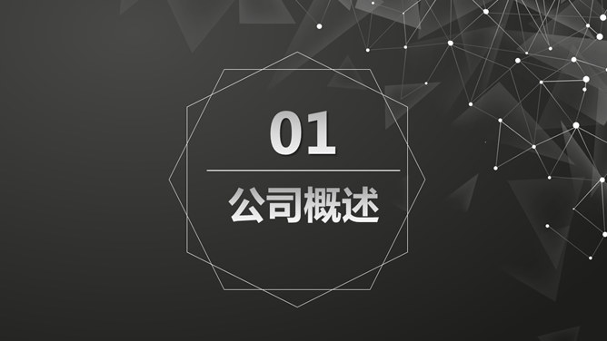 简约企业宣传公司介绍PPT模板。一套简约大气的公司介绍企业宣传幻灯片模板,黑色点线粒子背景,动态播放。