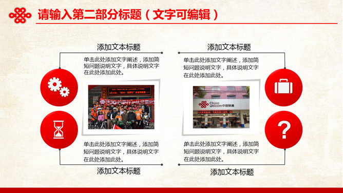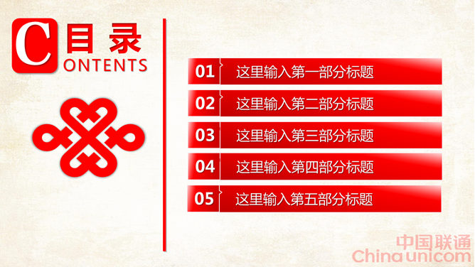 中国联通工作汇报PPT模板。一套中国联通公司专用幻灯片模板,适合联通公司员工工作总结汇报、竞聘述职等用途。