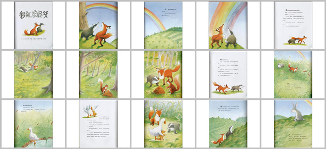 《彩虹的尽头》绘本故事PPT。狐狸和獾喘着气说:哇,好美呀。一道明亮的彩虹像宝石项链一样挂在天上。他们俩看呆了。獾说:你知道吗,彩虹的尽头有宝贝。狐狸问:什么宝贝?獾说:不知道,应该是金的,银的,能让人变得永远富有。狐狸兴奋的说:那我们赶快去找宝贝吧。于是他们就出发了。他们赶路的时候,满脑子都是宝贝,会是什么样子的呢。这时,他们看到了一只松鼠,在橡果前面