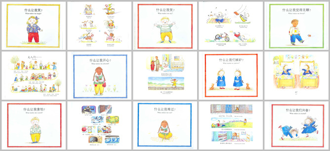 《我为什么快乐》绘本故事PPT。什么让我笑?大大的红鼻头、挠挠脚趾头、边吃边玩、扮个鬼脸、我的朋友倩倩、疯疯癫癫。什么让我哭?秋千上脱了手、被大黄蜂蛰一口、摔了一个大跟头、摇摇晃晃的车轱辘。什么让我觉得无聊?大人们见面、吃东西、叹气、唠叨、说话、走路、读书、坐着、买东西。什么让我开心?我一个人也能做到、我长得这么高。什么让我们嫉妒?她。什么让我害怕