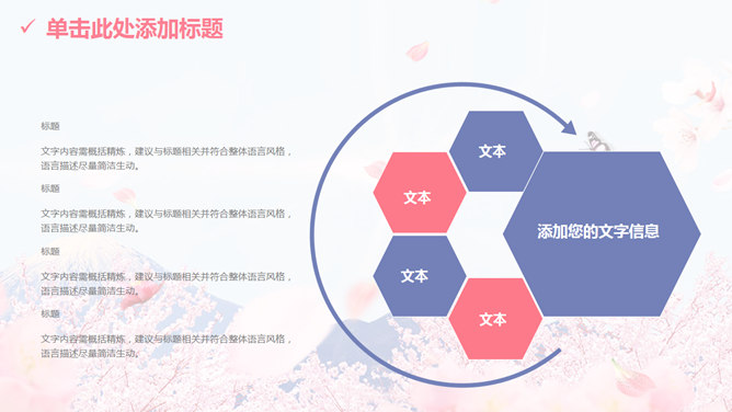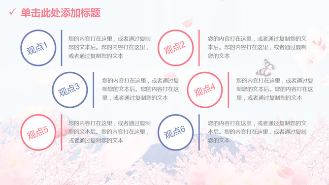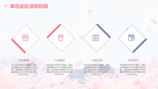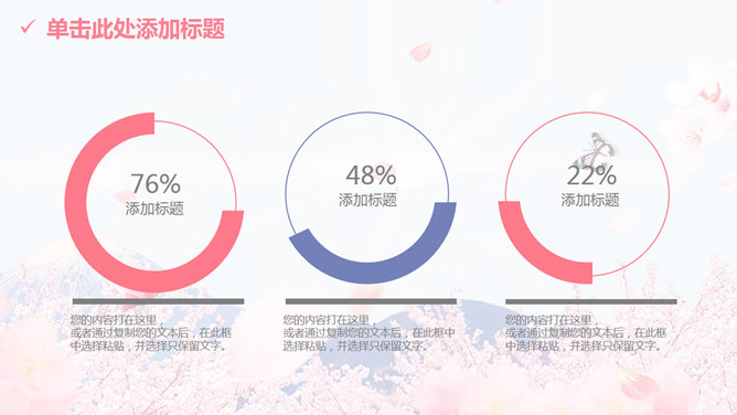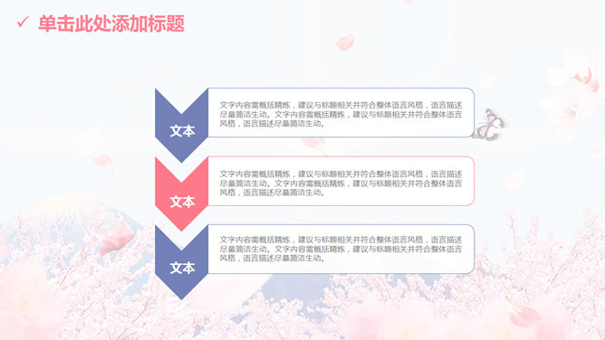 清新唯美浪漫桃花樱花PPT模板。一套多功能通用幻灯片模板,以富士山下唯美樱花为背景,清新粉蓝配色,动态播放。