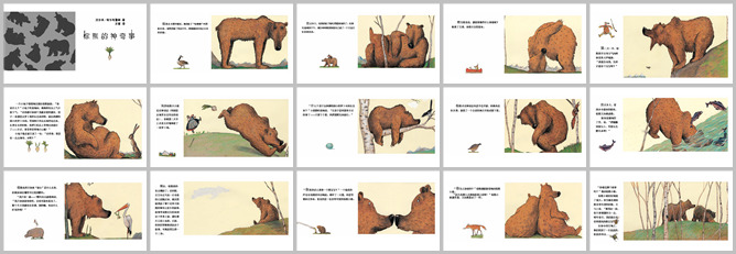 《棕熊的神奇事》绘本故事PPT。棕熊从冬眠中醒来,他的肚子很饿,谁要是睡了半年都会饿的。没多久棕熊就吃饱了,晒着太阳,想象着自己成了熊爸爸。当了熊爸爸要做什么事情呢,他想了想,没想出答案。第二天,他向着树林大喊道:谁能告诉我怎么才能有个熊宝宝啊。一只小兔子来到棕熊面前说:你说什么?这你都不知道?我亲爱的朋友,我告诉你吧,孩子都是从萝卜里长出来的
