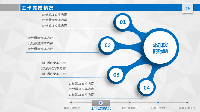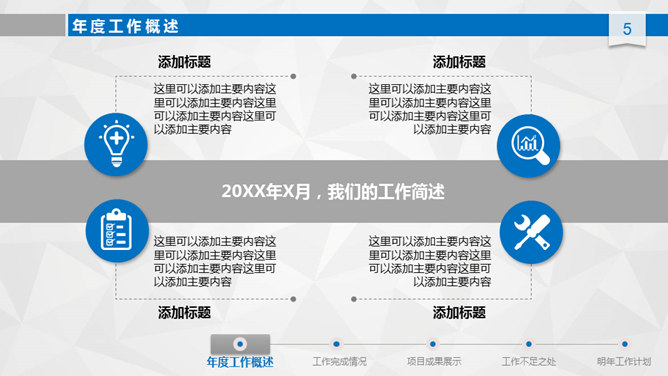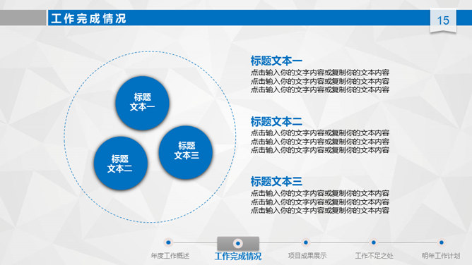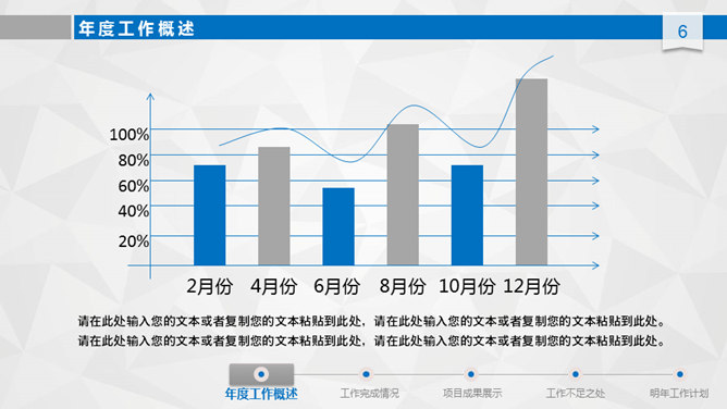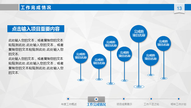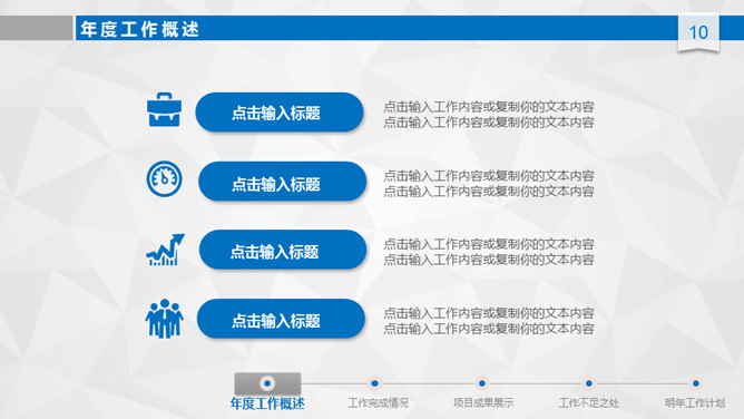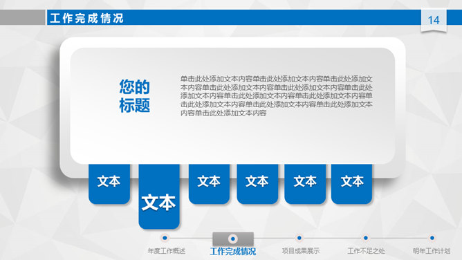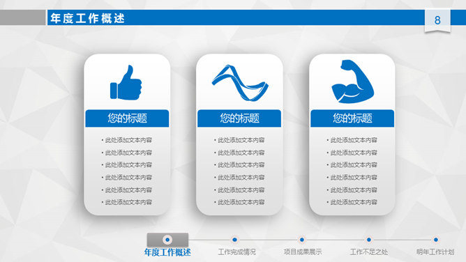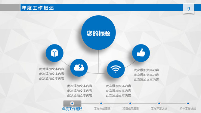 大气工作总结计划汇报PPT模板。一套工作总结计划汇报报告幻灯片模板,大气蓝色主色调,共45页,页面丰富实用。