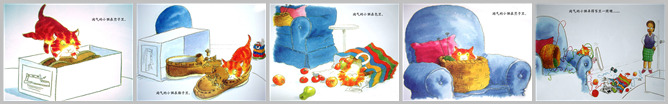《淘气的小猫》绘本故事PPT。淘气的小猫在盒子里,在鞋子里,在包包里,在篮子里,弄得家里一团糟,淘气小猫在姥姥的怀抱里睡着了
