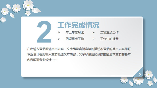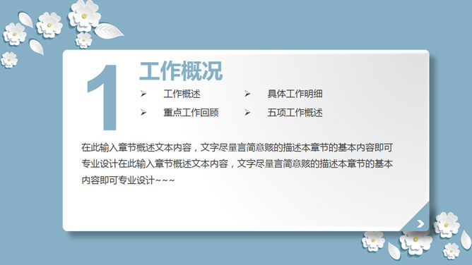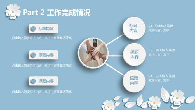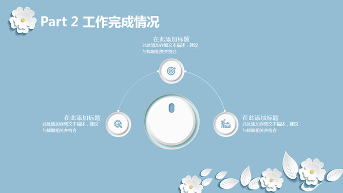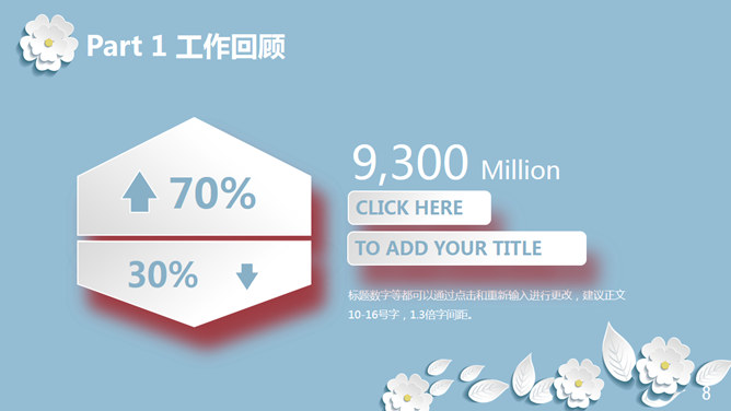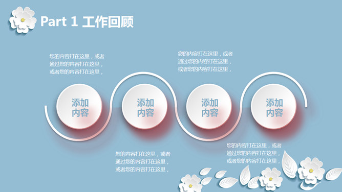 清新淡雅微立体小花PPT模板。一套多功能通用幻灯片模板,浅蓝色背景,白色微立体形状小花元素装饰,淡雅清新。