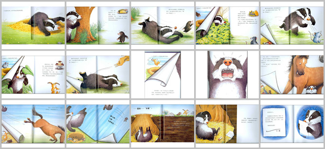 《獾的美餐》绘本故事PPT。獾的家里有很多食物,但是他不开心。他叹了口气说:苹果、萝卜、虫子、土豆,老是这些,我希望换个口味,吃一顿美餐。于是他爬出洞穴,去找美食。不久,他就拦住了一只从他身边路过的鼹鼠,他想:用加了香料的沙拉做个鼹鼠卷肯定很好吃。于是他就扑过去抓鼹鼠,但是鼹鼠一下就从他手里溜走了,躲了起来。獾特别食物,但是很快他就忘了,因为