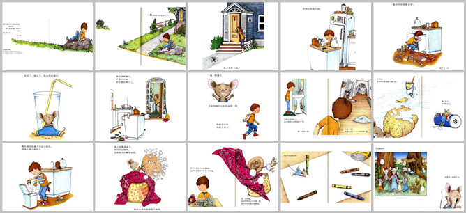《要是你给老鼠吃饼干》绘本故事PPT。要是你给老鼠吃饼干,他还会要一杯牛奶。等你给他牛奶,他还会问你要一根麦管。喝完了,吃完了,他还会要一块餐巾。他还会照镜子,不要牛奶沾到他胡子上。如果他照镜子,他会说他的头发还得剪一剪。会找你借一把小剪子。等头发剪完了,他会要扫把把地扫干净。他一开始打扫就来劲了,会把整个房子打扫一遍。不仅扫,还要用水把地板刷一遍