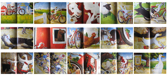 《鸭子骑车记》绘本故事PPT。一天,在农场里,鸭子冒出了一个主意,“我肯定会骑车。”他一摇一摆的走到自行车边爬上去,骑了起来。他刚开始骑的很慢,左摇右摆很好玩。鸭子骑过母牛旁,招了招手说:你好啊,母牛。母牛心想:一只鸭子怎么在骑车,真是太蠢了。鸭子骑过绵阳旁,打招呼说:你好,绵羊。绵羊心想:小心点吧,会受伤的。这会鸭子骑的好多了,他骑过狗旁