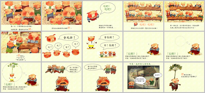 《子儿,吐吐》绘本故事PPT。胖脸二不管站在哪,他都是一个被认出来的猪。因为他的脸最胖。胖脸儿最爱说的一句话就是吃吧,吃吧。胖脸今天又是第一个吃完木瓜。第一个吃完不奇怪,奇怪的是他桌子上没有一粒子儿。子儿呢?胖脸儿吃子儿了,怎么办?会死掉的。会长树!胖脸儿想想自己的头上长树,突然哭了起来。快看胖脸头上长树了,谁叫他吃那么快呢