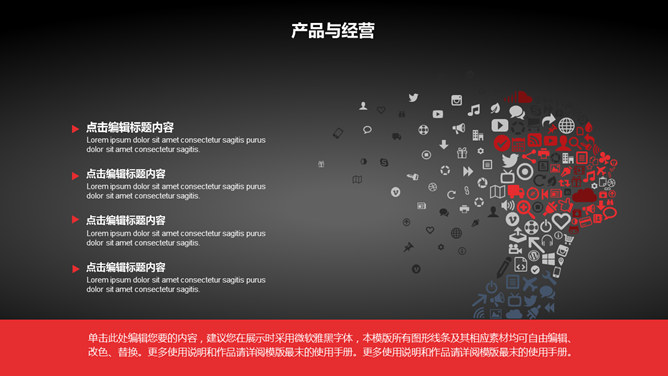 黑红点线大气商务PPT模板。一套欧美范商务幻灯片模板,经典黑红配色,简约大气排版,使用字体: