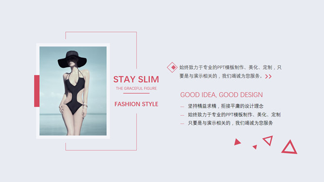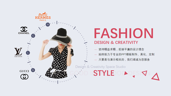 女性时尚潮流PPT模板下载。一套女性时尚潮流主题幻灯片模板,适合奢侈品牌介绍、服装、配饰产品介绍宣传等。