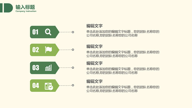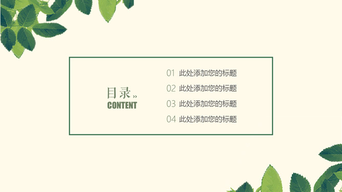 淡雅清新简约绿叶PPT模板。一套多用途通用幻灯片模板,米黄色背景,绿色主色调,绿叶装饰,清新淡雅。