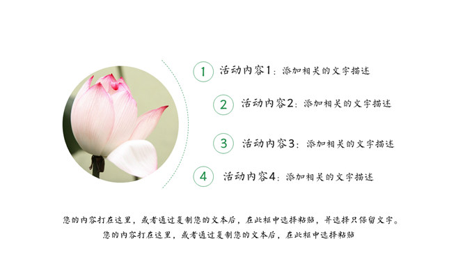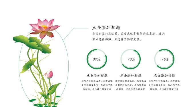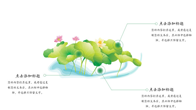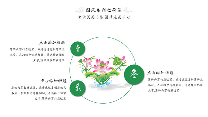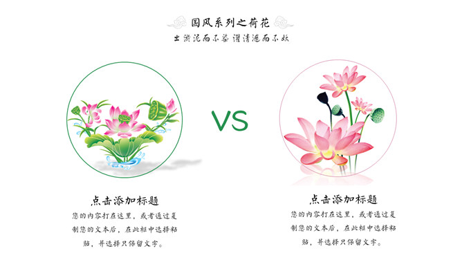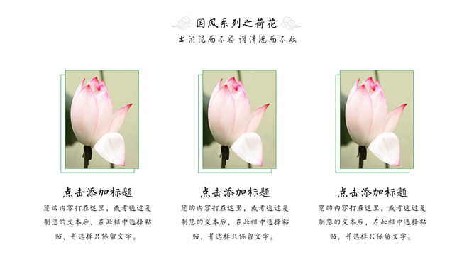 淡雅唯美荷花中国风PPT模板。一套简约清新淡雅中国风幻灯片模板,荷花主题设计,建议安装字体: