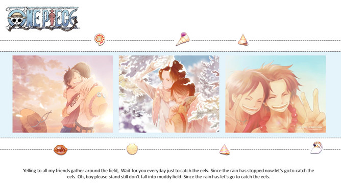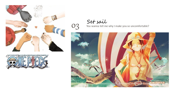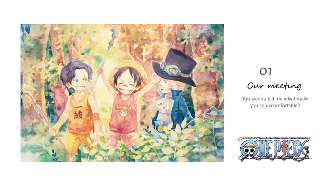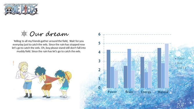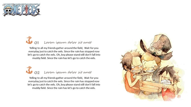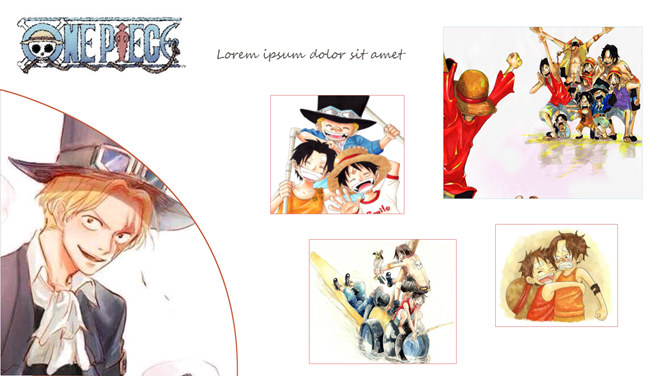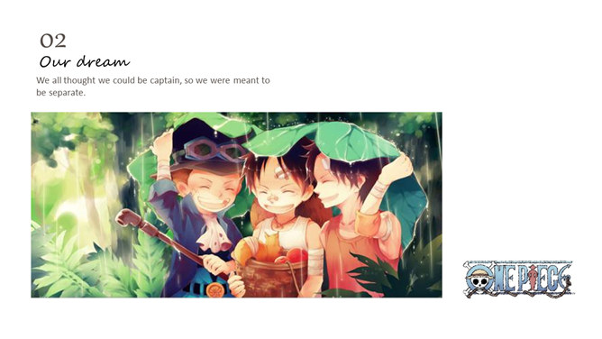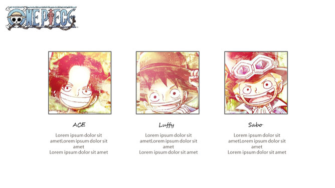 海贼王路飞三兄弟PPT模板。一套以动漫海贼王三兄弟艾斯、萨博、路飞为主题设计的幻灯片模板。