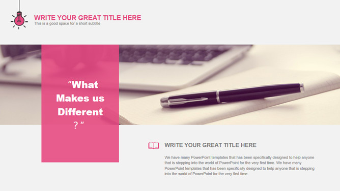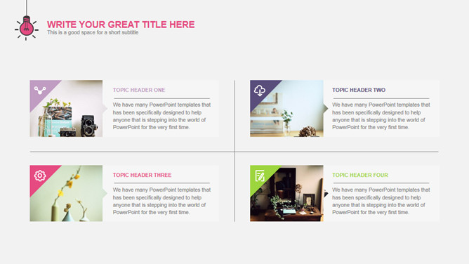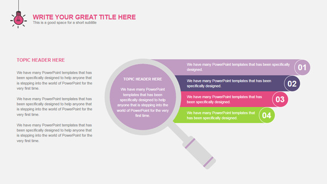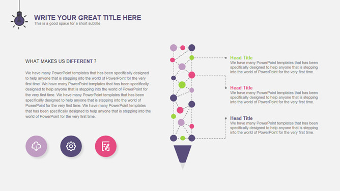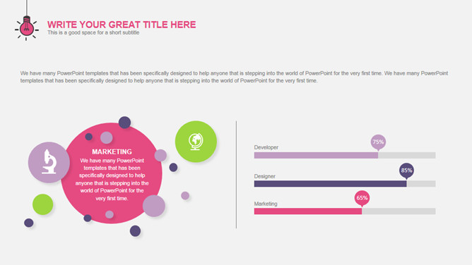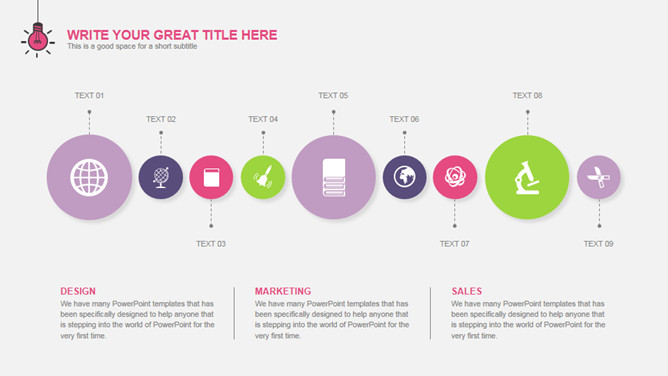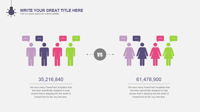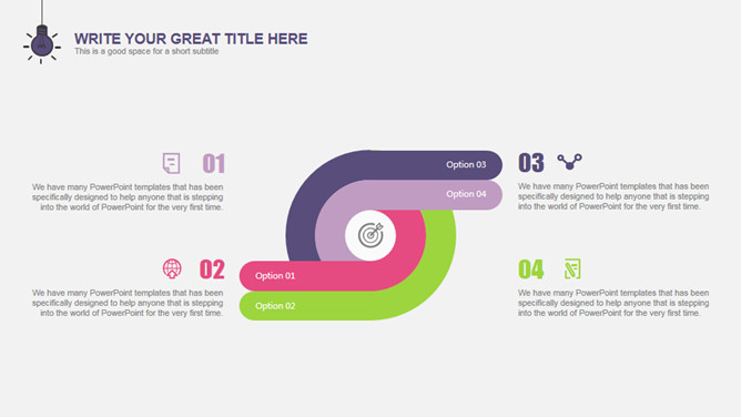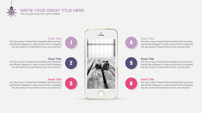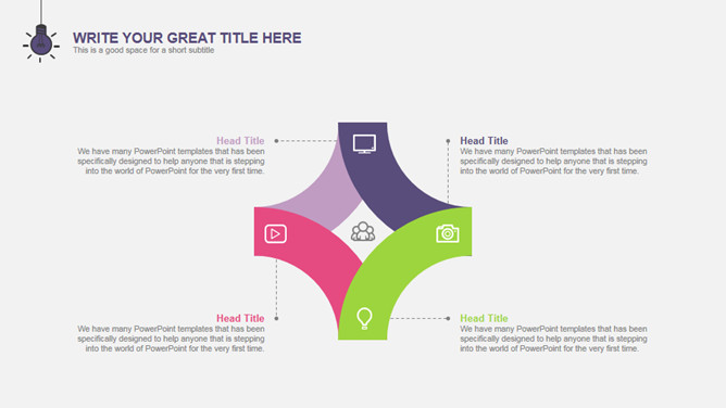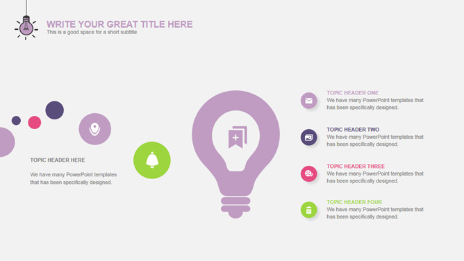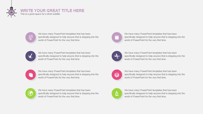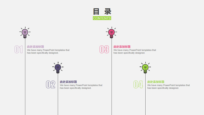 简约创意多彩小灯泡PPT模板。一套创意简约幻灯片模板,清新彩色配色,小灯泡装饰,图形图表页面丰富。