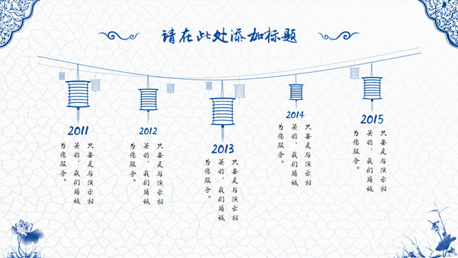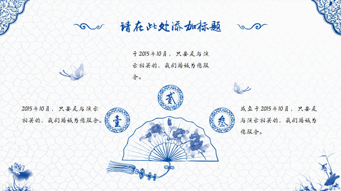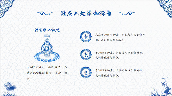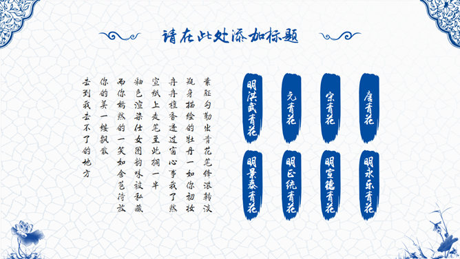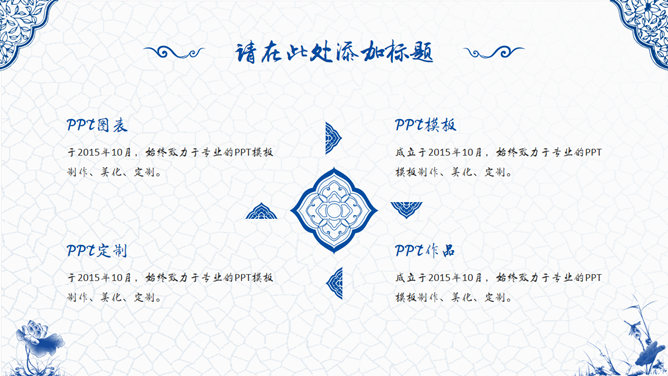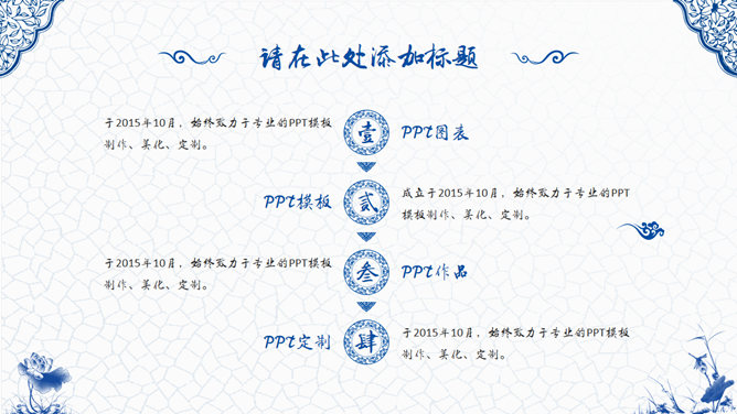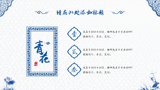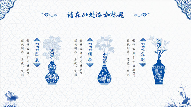 精美中国风青花瓷PPT模板。一套古典中国风幻灯片模板,青花瓷效果设计。使用字体: