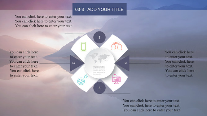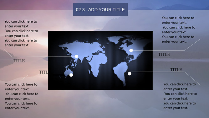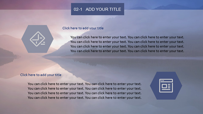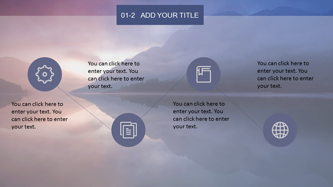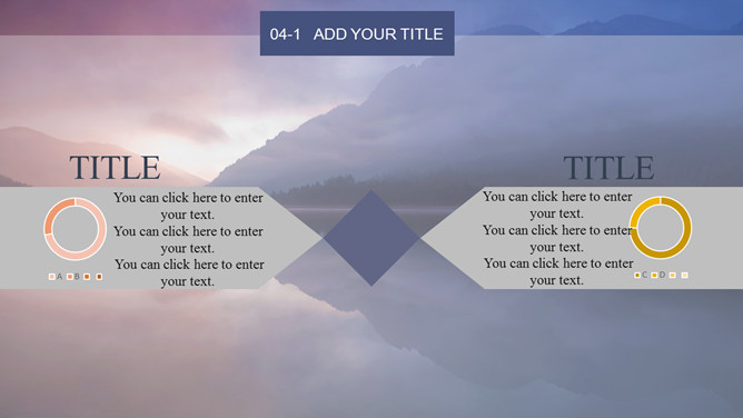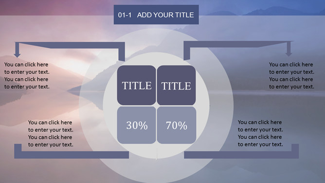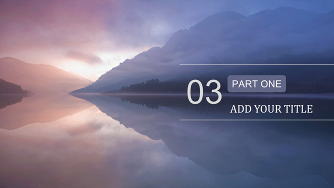 唯美湖光山色风景PPT模板。一套自然风景类幻灯片模板,黄昏湖光山色风景背景,多图表,框架结构完整。