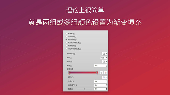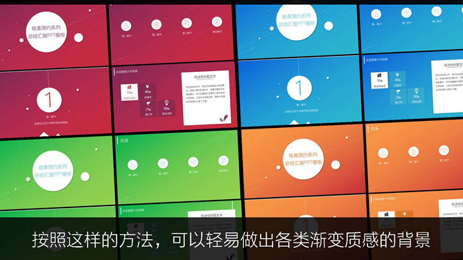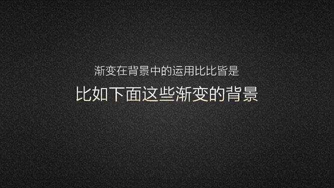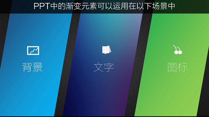 我们聊聊PPT中渐变的逼格“渐变的运用”,PPT中的渐变匀速可以运用在以下场景中:背景、文字、图标。渐变在背景中的运用比比皆是,比如下面这些渐变的背景。这些背景图或渐变元素在哪找的?实际上就是在PPT中制作的。理论上很简单,就是两组或多组颜色设置为渐变填充