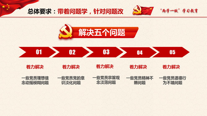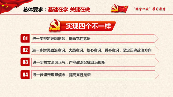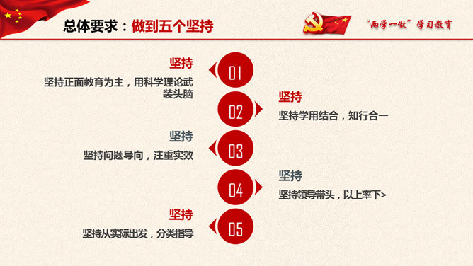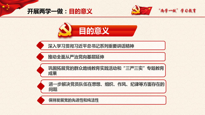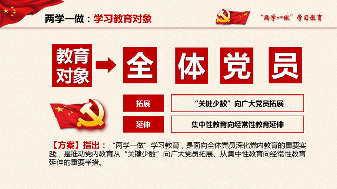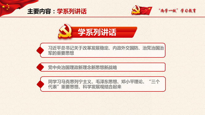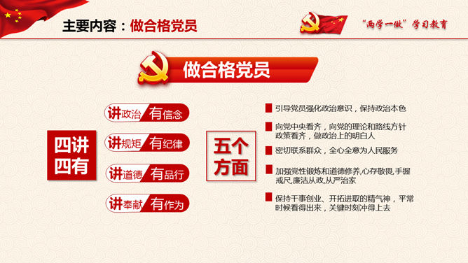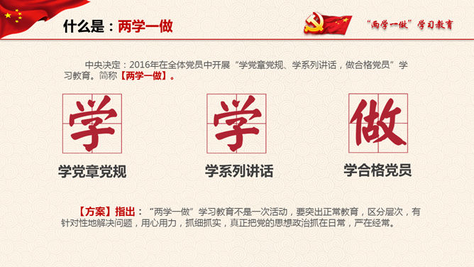 两学一做党课课件PPT模板。一套设计精美的两学一做主题幻灯片模板,稍作修改也可用于其他党课课件的制作。