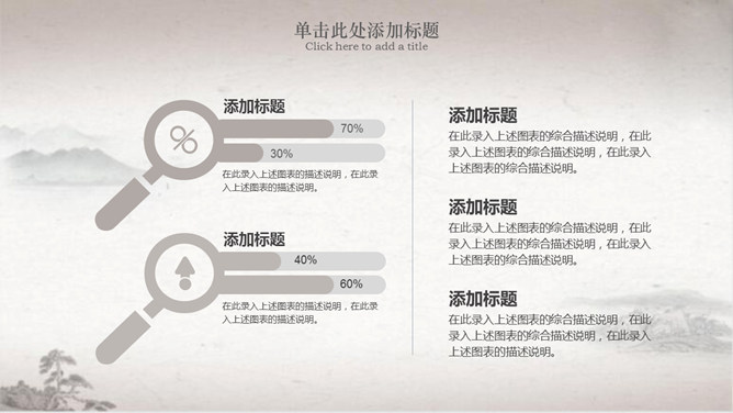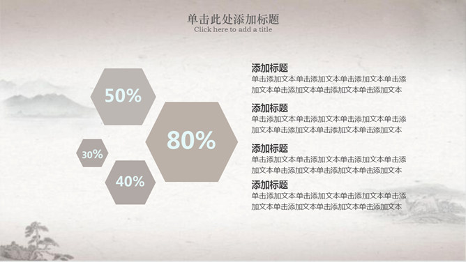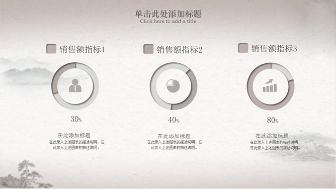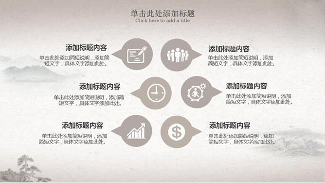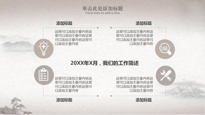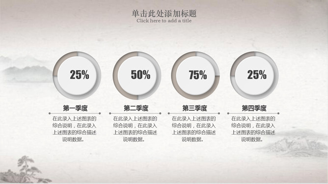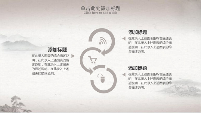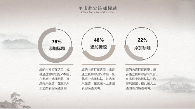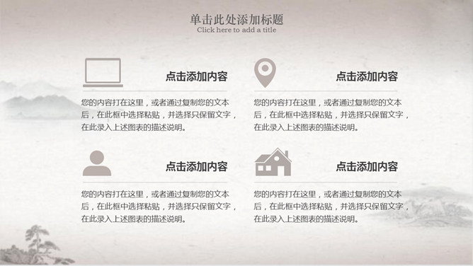 简约淡雅古典中国风PPT模板。一套复古中国风幻灯片模板,云雾远山背景,淡雅简约。