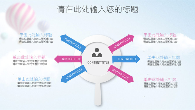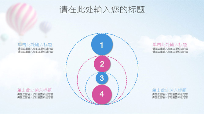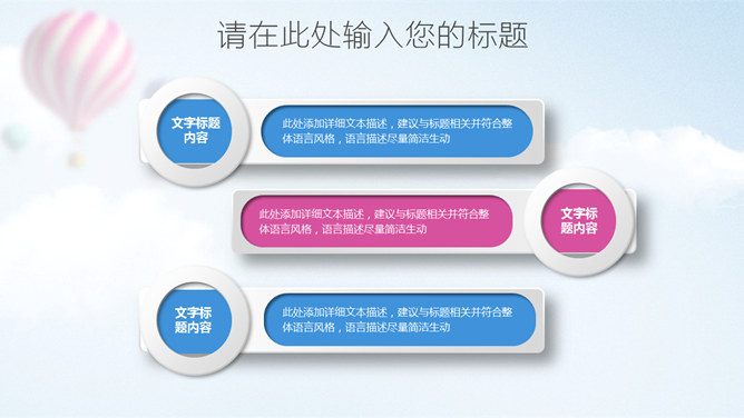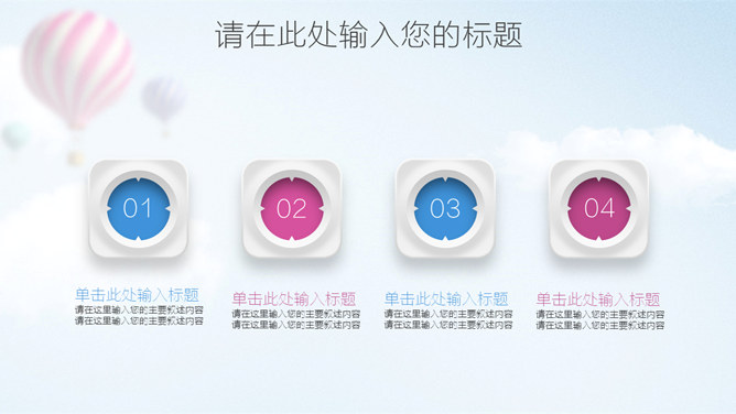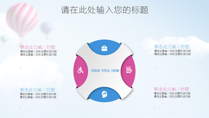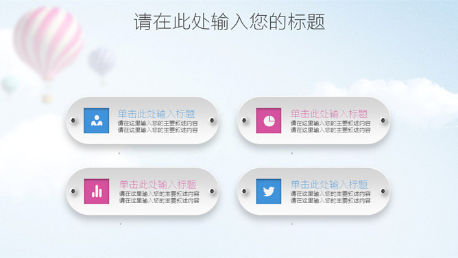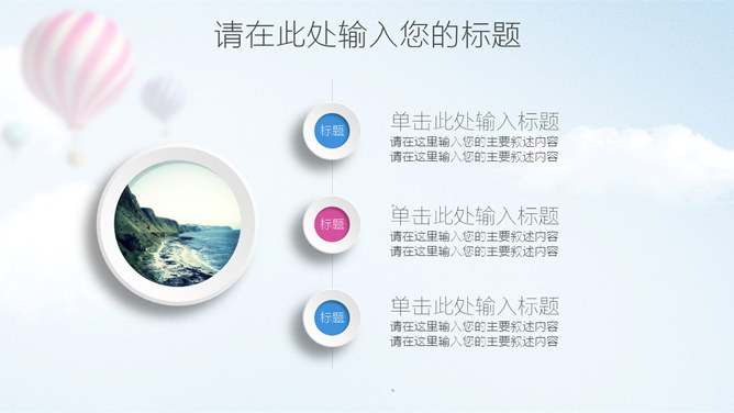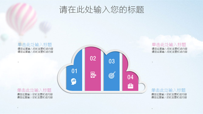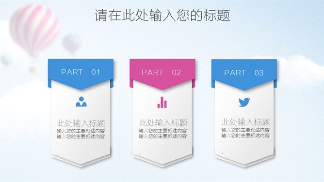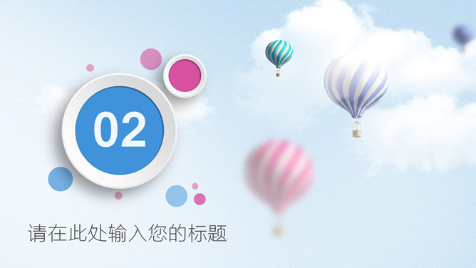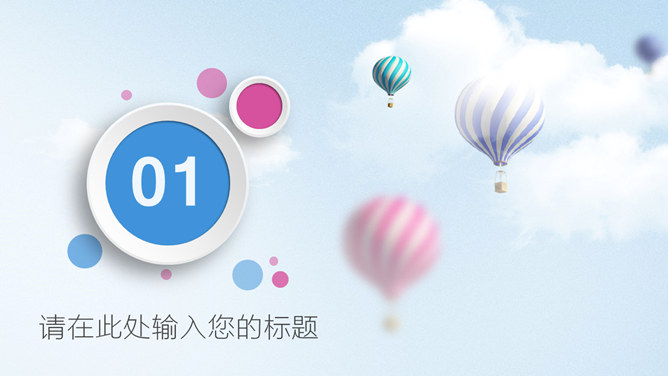清新蓝粉工作汇报PPT模板。一套工作总结汇报报告幻灯片模板,清新蓝粉配色,天空中的热气球背景,图表丰富。
