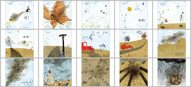 《放屁的苍蝇》绘本故事PPT。苍蝇对着蝴蝶放了一个屁。蝴蝶非常生气,扑棱扑棱飞走了。一望无际的大草原上,小黄花摇摇晃晃。花朵上的露珠滚落下来。小虫子从泥土里钻出来。蛤蟆跳过河堤,直接扑了过来。骑脚踏车的邮差掉进了排水沟。消防车停下把他救了起来。森林大火越烧越旺。风把浓烟越吹越高,飞机看不到前方,坠落在城市里。人们以为爆发了战争,互相攻击