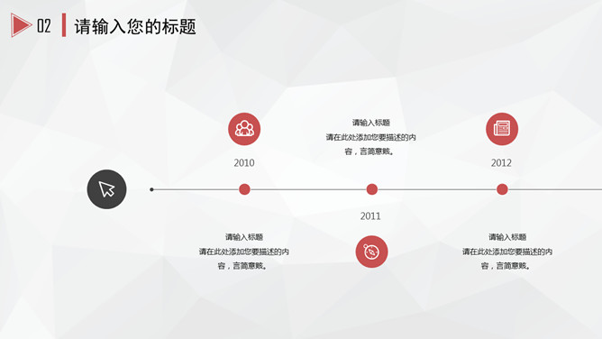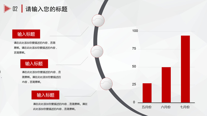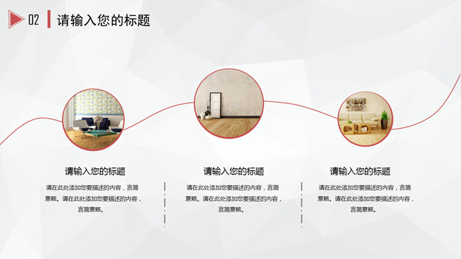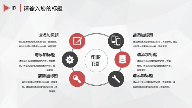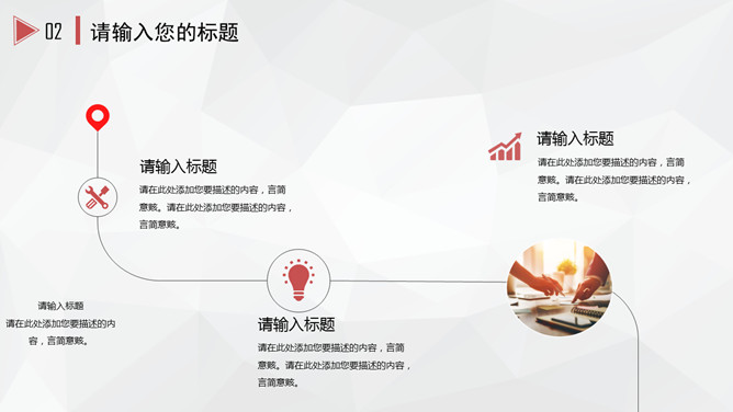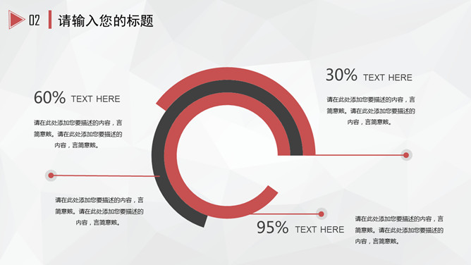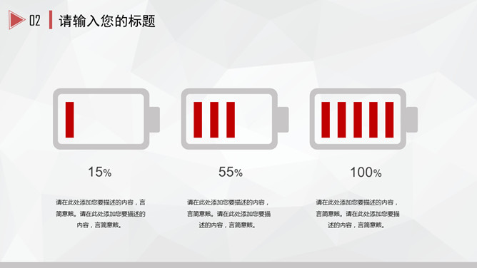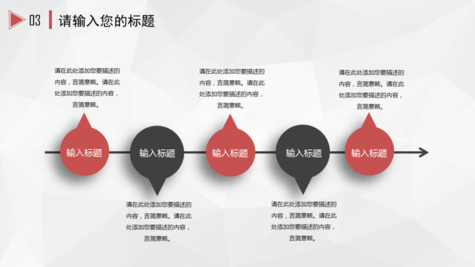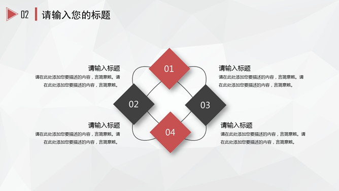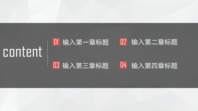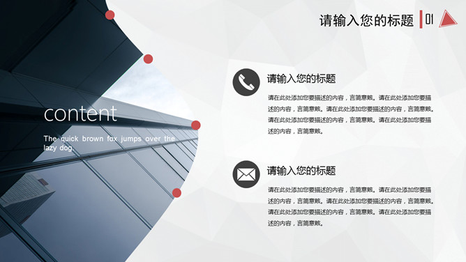 大方极简商务通用PPT模板。一套大气商务幻灯片模板,红黑配色,小三角形装饰,极简风格,通用性强。