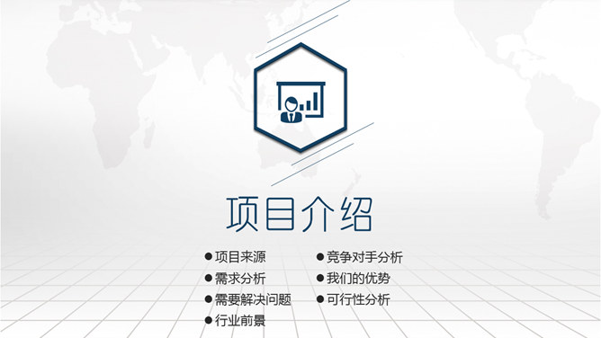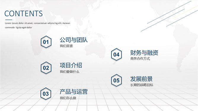 高端大气商业融资计划书PPT模板。一套创业商业融资计划书幻灯片模板,大气浅灰世界地图背景,页面丰富实用。
