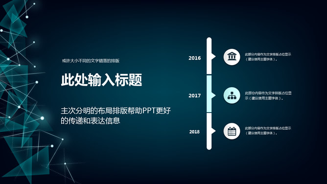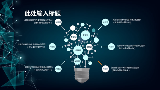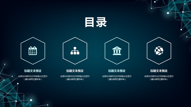 点线粒子科技感商务PPT模板。一套科技感商务汇报幻灯片模板,点线粒子效果设计,框架结构完整,动态播放。