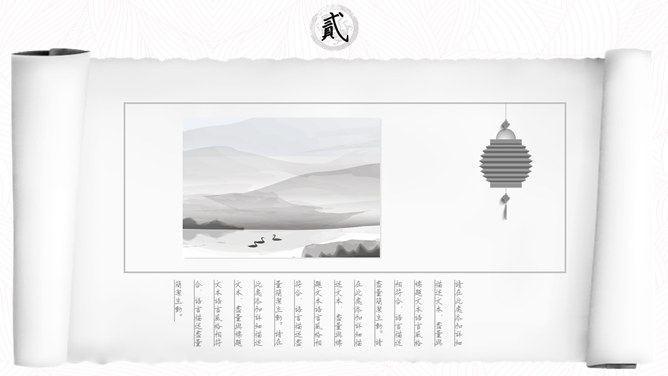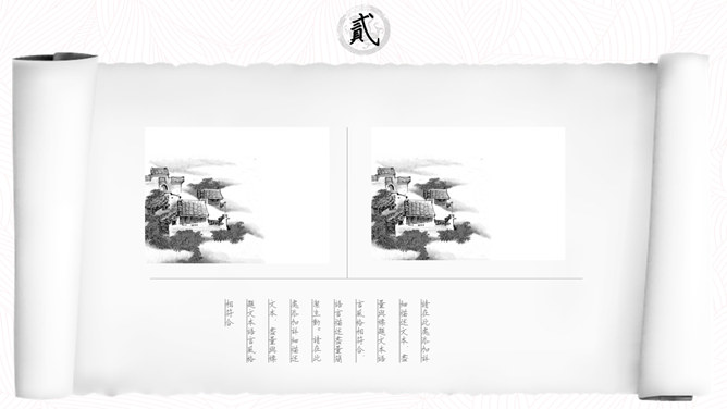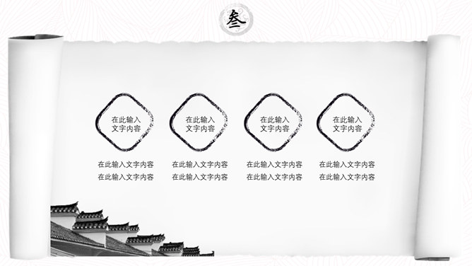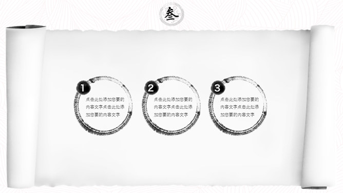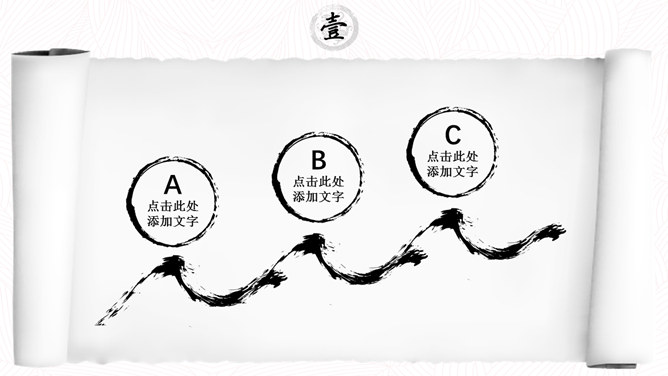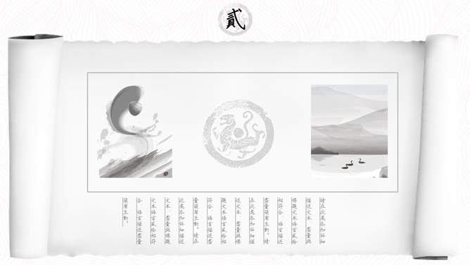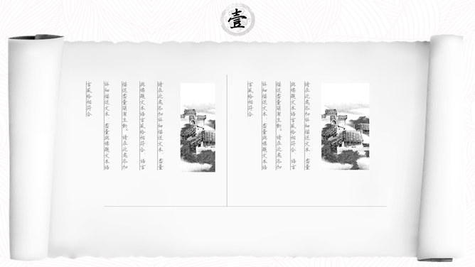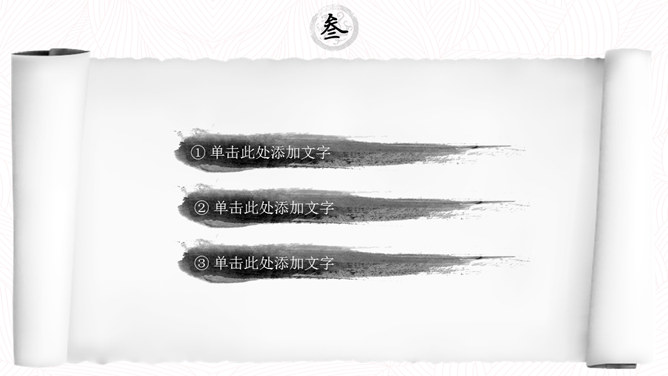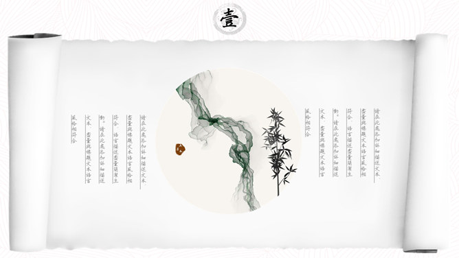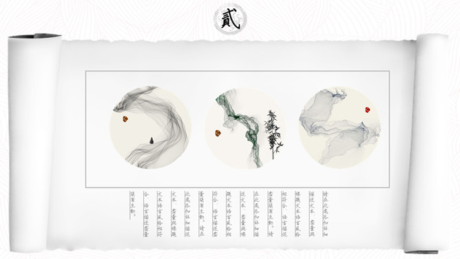 创意水墨卷轴中国风PPT模板。一套创意古典中国风幻灯片模板,水墨卷轴效果设计,使用字体: